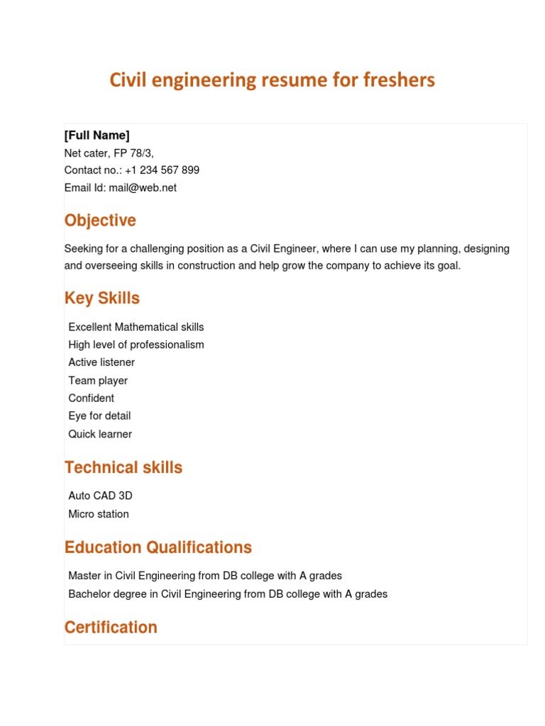 Career Objective Freshers Experienced Writing Tips Samples from d2tv8vuq6rk4tj.cloudfront.net Keep in mind that the other applicants may be as, or more qualified than you are. Objective seeking for a challenging position as a civil engineer, where i can use my planning, designing and overseeing skills in construction and help grow the company to achieve its goal. They are responsible for gathering project requirements, testing and evaluating building sites and materials, and managing the overall building process from start to finish. If you're submitting your resume via an online system or form, you're almost guaranteed to be dealing with an ats. Answer a few questions & your resume will make itself! To be an outstanding team. Next, the fresher should concentrate on his/her education and credentials, then professional work experience below it. Fresher's resume for civil engineering fresher.
